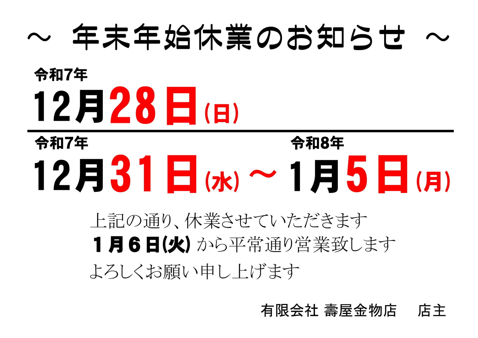 年末年始休業のお知らせ