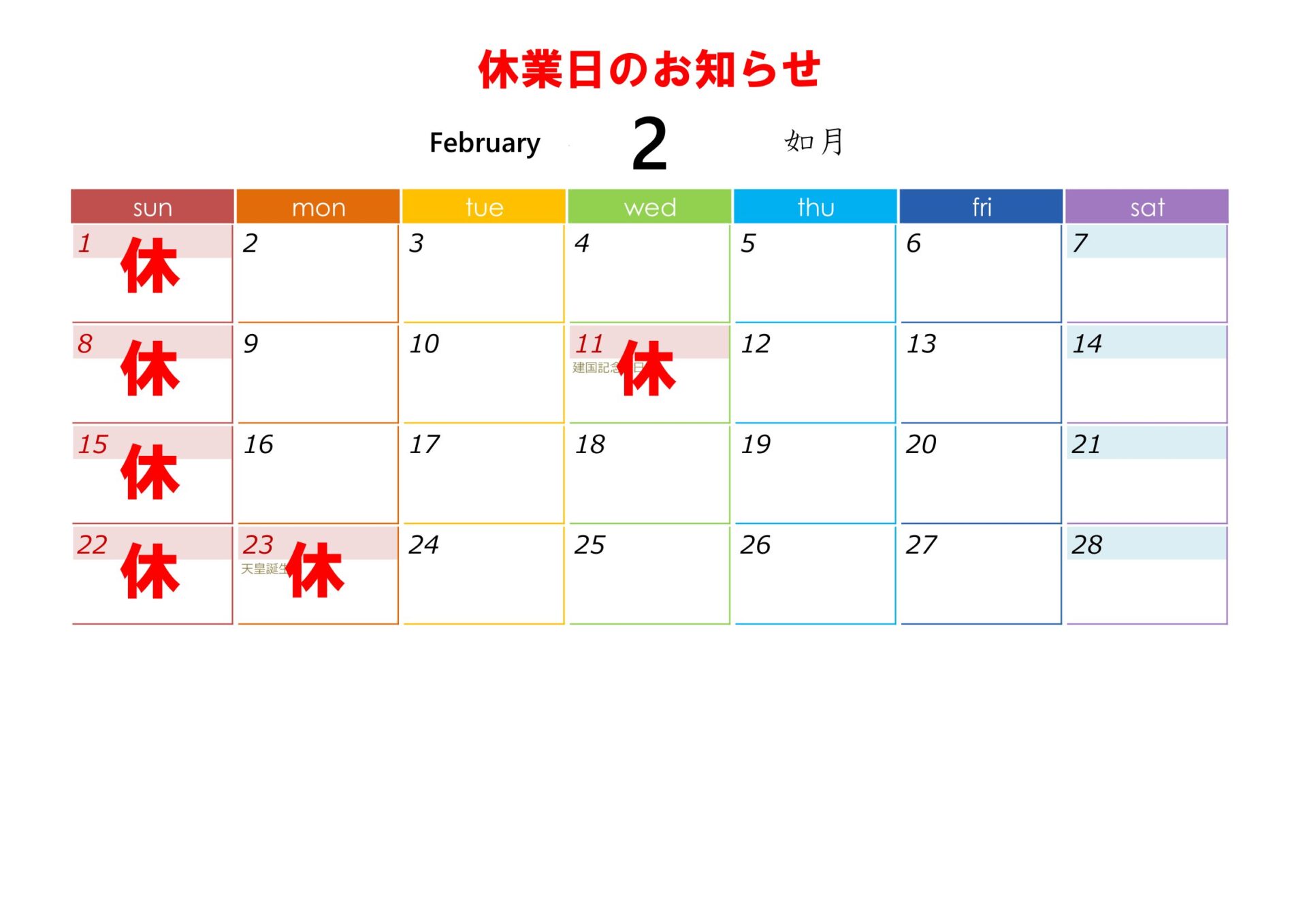 2026年2月の営業カレンダー